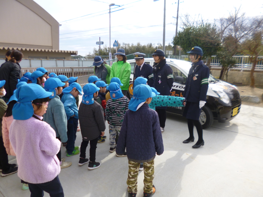 1月24日(金)に市役所の方や交通指導員の方が来園してくださり、交通安全のルールや大切さを教えて頂きました。なんで道路で遊んじゃだめなの?道路を渡る時に、なんで手を挙げるの?などの問いかけに、元気に手を挙げて答えていた子ども達でした。青組の子ども達は、実際に道路に出て信号を見ながら、横断歩道を渡る練習もし、いつもに増して真剣な顔の青組の子ども達でした。 これからの散歩の時や登降園の時にも教えて頂いたことを、しっかり守っていけるようにしていきたいと思います。